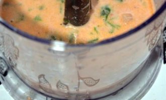 Переложите половину смеси в блендер и доведите до кремообразной консистенции, потом полученный соус положите обратно в сковороду.