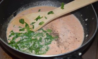 В сковороду добавьте коньяк и оставьте на несколько минут его выпариваться, затем добавьте сливки, томатный соус, молотый перец, и уже в конце нарубленную петрушку и соль по вкусу. Хорошенько размешайте ингредиенты и выключите огонь.