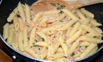 Отварите пасту по инструкции минус 1 минута слейте воду, переложите в сковороду, как следует перемешайте и оставьте на минутку отдохнуть. Подавайте сразу же.