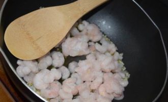 Тем временем, поставьте на огонь глубокую сковороду, налейте в нее оливковое масло и выдавите чеснок, в течение нескольких секунд разогрейте, затем добавьте креветки и оставьте на среднем огне. Мелко нарубите петрушку и отложите пока ее в сторону.
