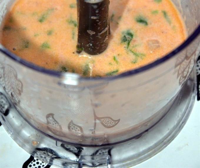 Переложите половину смеси в блендер и доведите до кремообразной консистенции, потом полученный соус положите обратно в сковороду.