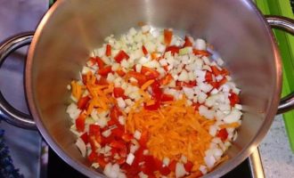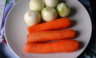 Лук мелко порезать, морковь натереть. На растительном масле обжарить немного половину лука, затем добавить половину моркови.