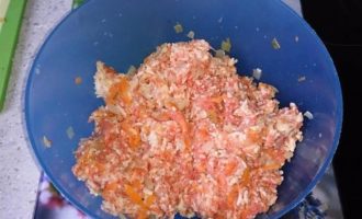 Фарш смешать с рисом, добавить обжаренные морковь с луком, посолить, поперчить, приправить паприкой порошком. Все хорошо перемешать.