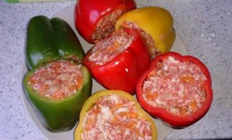 Тушить на среднем огне под крышкой 45 минут. Подавать, посыпав укропом и с соусом, в котором готовились перцы.