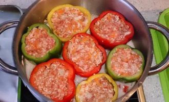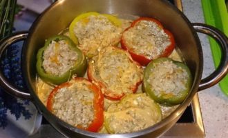 Выложить фаршированные перцы. Долить воды, чтобы перцы наполовину были в соусе.