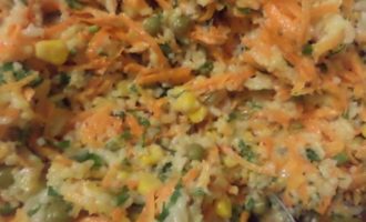 • В большой миске соединить рис, морковь, кукурузу, горошек, нарезанную зелень петрушки, добавить майонез, посолить, поперчить, перемешать.