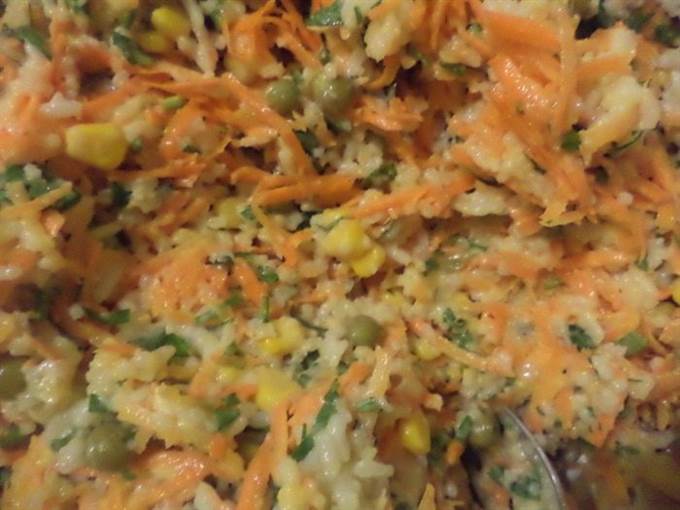 • В большой миске соединить рис, морковь, кукурузу, горошек, нарезанную зелень петрушки, добавить майонез, посолить, поперчить, перемешать.