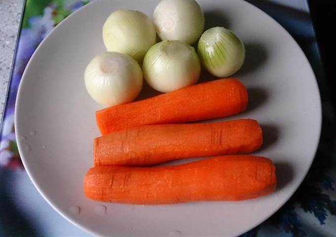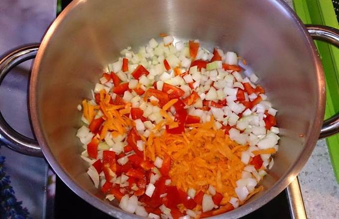 Лук мелко порезать, морковь натереть. На растительном масле обжарить немного половину лука, затем добавить половину моркови.