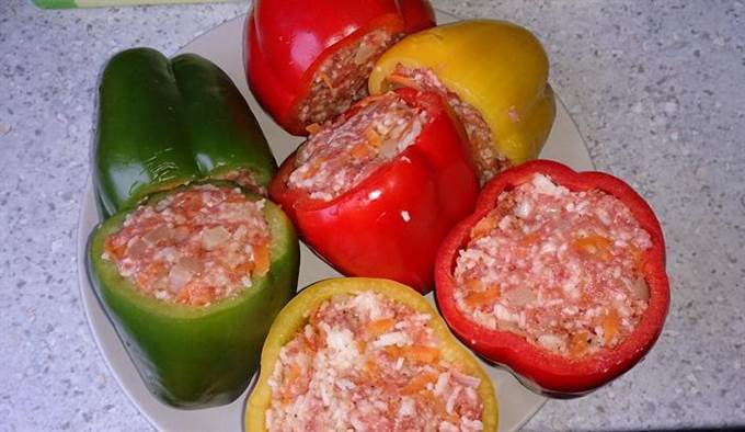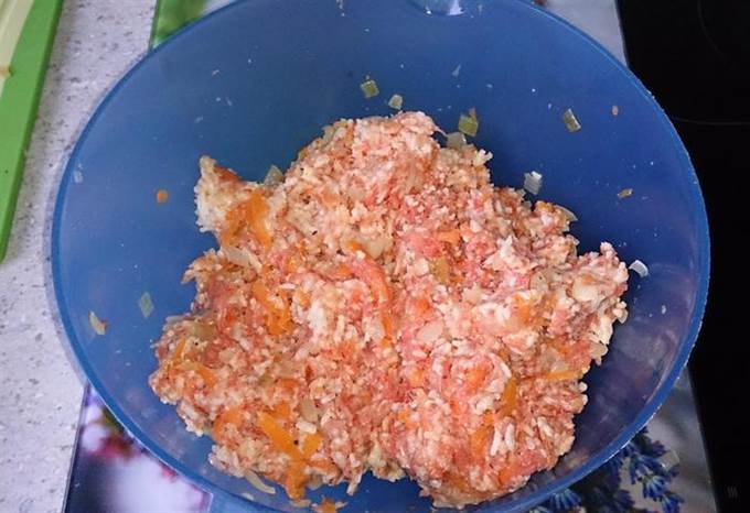 Фарш смешать с рисом, добавить обжаренные морковь с луком, посолить, поперчить, приправить паприкой порошком. Все хорошо перемешать.