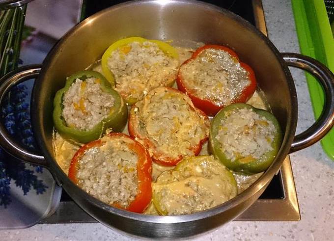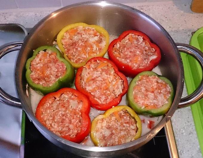 Выложить фаршированные перцы. Долить воды, чтобы перцы наполовину были в соусе.