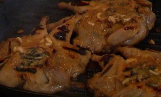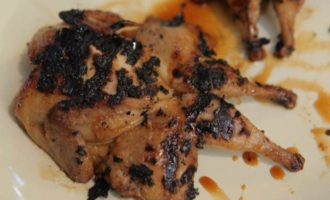 • Разогреть в сковороде-гриль оливковое масло, выложить перепелок кожей вниз и обжаривать с двух сторон до полной готовности, периодически смазывая маринадом.