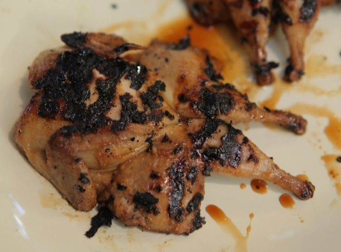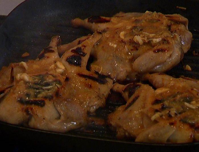 • Разогреть в сковороде-гриль оливковое масло, выложить перепелок кожей вниз и обжаривать с двух сторон до полной готовности, периодически смазывая маринадом.