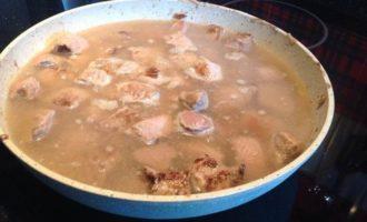 Добавьте бульон, накройте крышкой и тушите на медленном огне 1,5 часа.