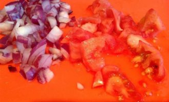 Лук и помидоры мелко нарежьте (при желании у помидора снимите кожицу).