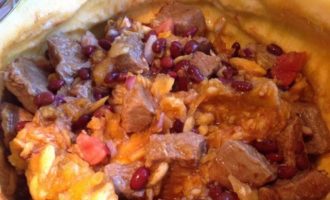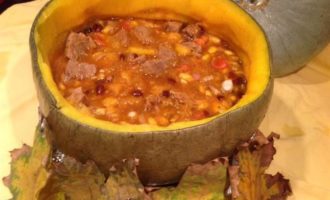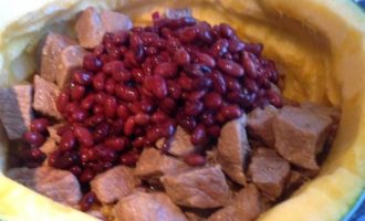 Выложите в тыкву лук, помидор, мясо (вместе с подливкой), фасоль (только слейте жидкость из банки).