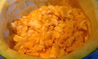 Духовку разогрейте до 200 градусов. У тыквы срежьте верхушечку, удалите семечки, соскребите ложкой немного тыквы, но так чтобы остались толстые стенки.
