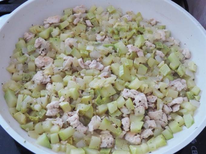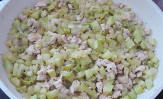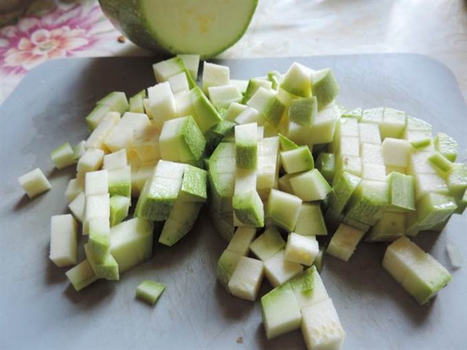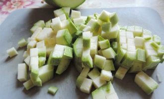 • В последнюю очередь нарезаем кубиками кабачок. Мне понадобился один среднего размера. Если он у вас перезревший, предварительно удалите семена и очистите его от кожицы. Кабачок сразу же отправляем на сковородку.
