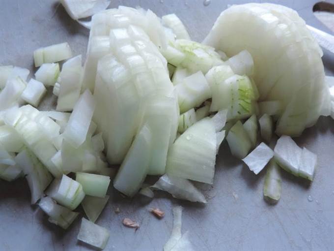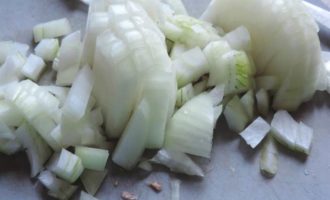 • Пока индейка обжаривается, мелко нарезаем лук. Сразу же отправляем на сковородку.