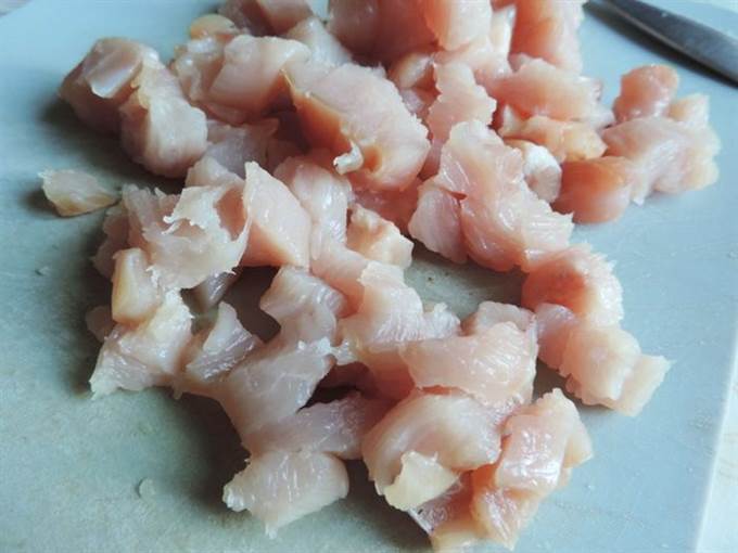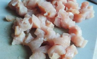 • Филе индейки нарезаем мелкими кубиками и отправляем на сковороду с разогретым растительным маслом.