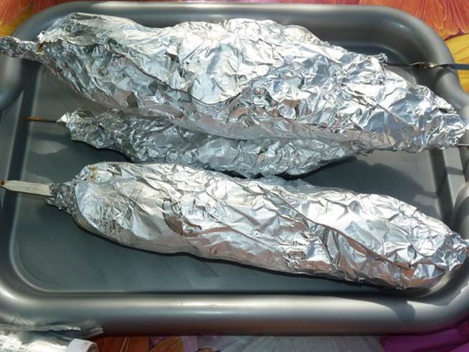 Каждый шампур оборачиваем фольгой в пару слоев.