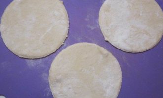 • Отделить от теста шарики размером с крупное яйцо. Раскатать в кружки толщиной 3-4 м. Вырезать кружки блюдцем.