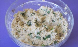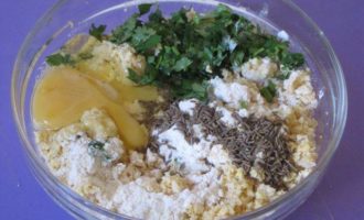 • Добавить 3 столовые ложки муки, зиру, половину мелко нарезанной зелени кинзы, яйцо, соль, черный молотый перец.