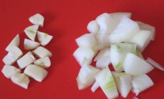 • Заранее, за 12 часов, замочить нут в большом количестве воды. За это время можно 1-2 раза поменять воду. Откинуть на дуршлаг. Лук и 3 дольки чеснока очистить и нарезать.