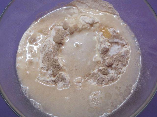 • Для питы просеять муку, добавить сухие дрожи, растительное масло. Влить воду с растворенной солью.