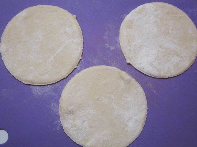 • Отделить от теста шарики размером с крупное яйцо. Раскатать в кружки толщиной 3-4 м. Вырезать кружки блюдцем.