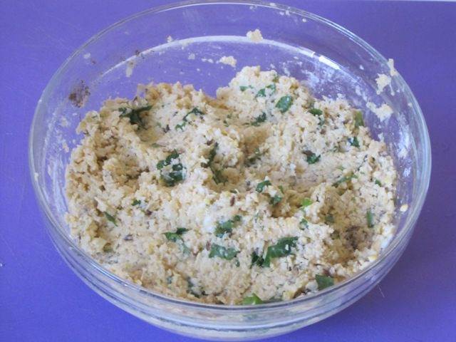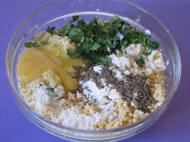 • Добавить 3 столовые ложки муки, зиру, половину мелко нарезанной зелени кинзы, яйцо, соль, черный молотый перец.