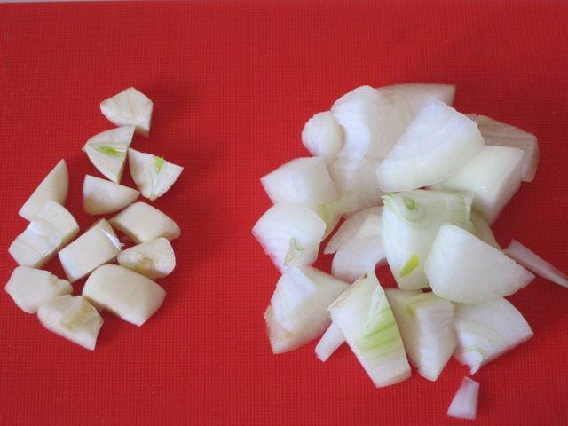 • Заранее, за 12 часов, замочить нут в большом количестве воды. За это время можно 1-2 раза поменять воду. Откинуть на дуршлаг. Лук и 3 дольки чеснока очистить и нарезать.