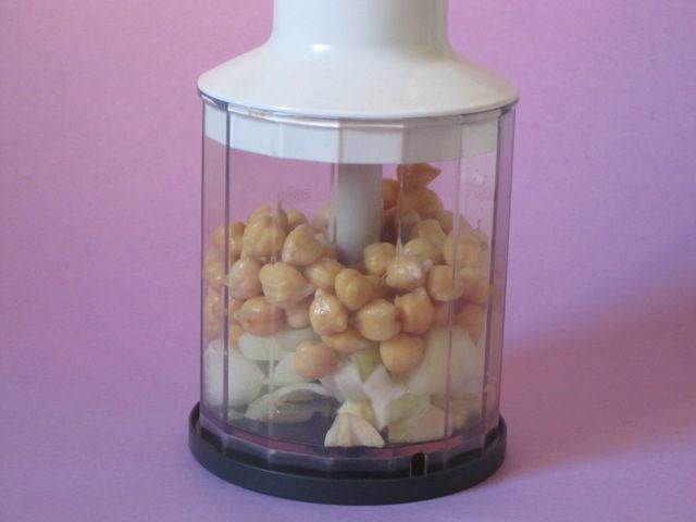 • Нут вместе с луком и чесноком выложить в блендер.