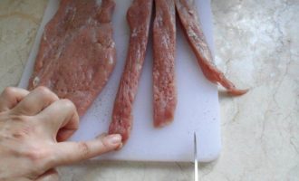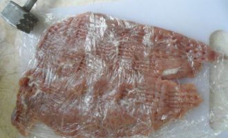 • Накрыть вырезки кухонной пленкой и чуть отбить тяпкой. Посолить, поперчить по вкусу.
