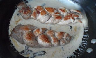 • Далее добавляем Сливовицу (у меня Граппа), даем пару минут выкипеть, добавляем сливки, возвращаем свиные косички и даем покипеть под закрытой крышкой 10-15 минут, до готовности свинины.