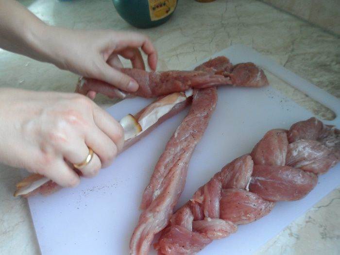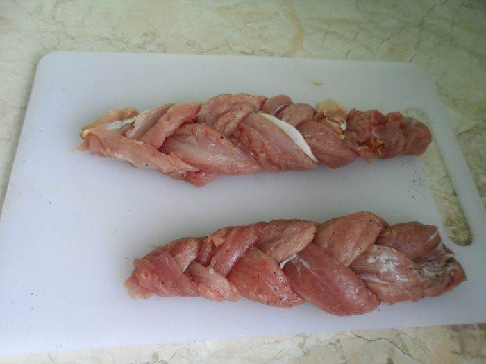 • На каждом филе сделать по-два разреза вдоль, так что бы получиось три полоски, верхний край при этом оставляем целым.