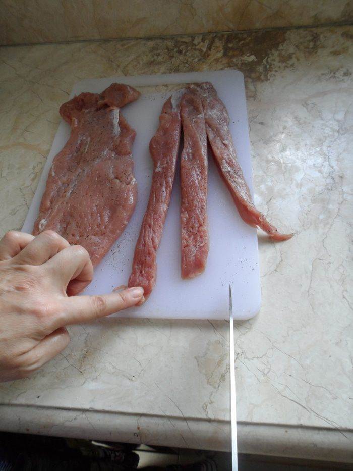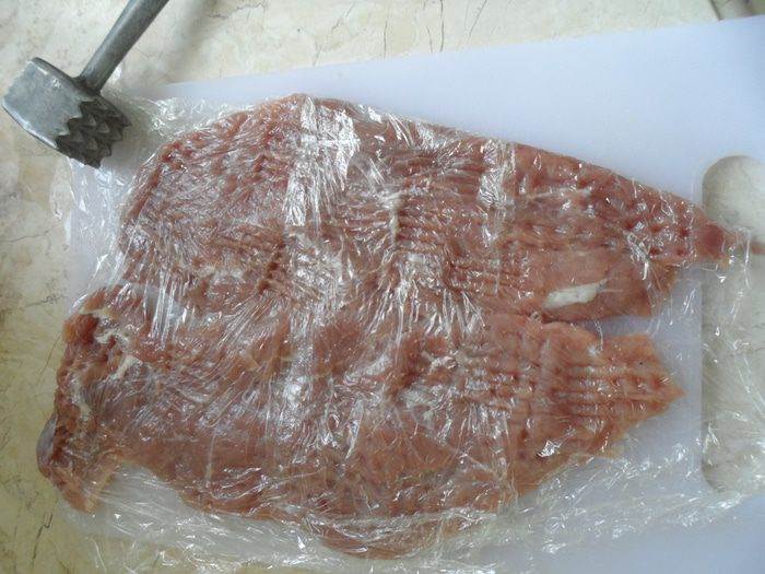 • Накрыть вырезки кухонной пленкой и чуть отбить тяпкой. Посолить, поперчить по вкусу.