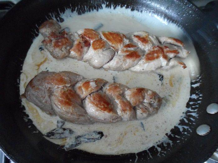 • Далее добавляем Сливовицу (у меня Граппа), даем пару минут выкипеть, добавляем сливки, возвращаем свиные косички и даем покипеть под закрытой крышкой 10-15 минут, до готовности свинины.