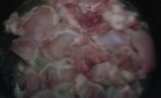 В чашу мультиварки наливаем пару ложек растительного масла, как подогреется, выкладываем подготовленную курицу (помыть, удалить хрящики, просушить бумажным полотенцем). В режиме «жарка», обжариваем курицу до золотистой корочки (у меня куриное бедро без кожи и без хребта).