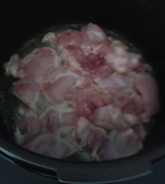 В чашу мультиварки наливаем пару ложек растительного масла, как подогреется, выкладываем подготовленную курицу (помыть, удалить хрящики, просушить бумажным полотенцем). В режиме «жарка», обжариваем курицу до золотистой корочки (у меня куриное бедро без кожи и без хребта).