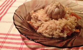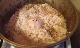 Заложить рис. Добавить специи. В середину положить целую головку чеснока.
