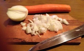 Очистить репчатый лук и морковь. Лук нарезать кубиками, морковь нашинковать соломкой.