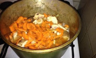 Добавить морковь, перемешать. Через 3 минуты влить 1 стакан воды, посолить и варить минут 10. -