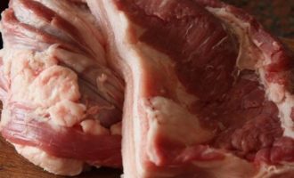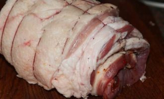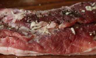 Разворачиваем его, солим, перчим по вкусу, рубим ножом чеснок и натираем им наш кусок.