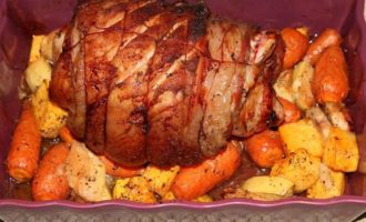 Духовку разогрела до 200 градусов, внизу поместила емкость с водой и отправила запекаться наше блюдо. Запекалось 2,5 часа. Влажная среда в духовке не даст пересохнуть ни овощам, ни мясу. Вот так красиво, ярко и аппетитно все получилось.