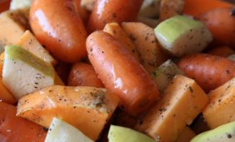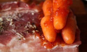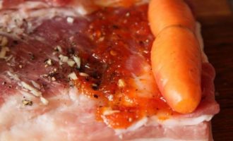 Я в этом рецепте использовала острый соус, кстати очень сильно рекомендую тем, кто любит необычные острые сочетания. С одной стороны намазала подчеревок соусом и выложила морковь.