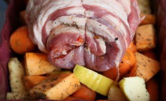 Затем в емкость для запекания выложила овощи и сверху поместила подчеревок.