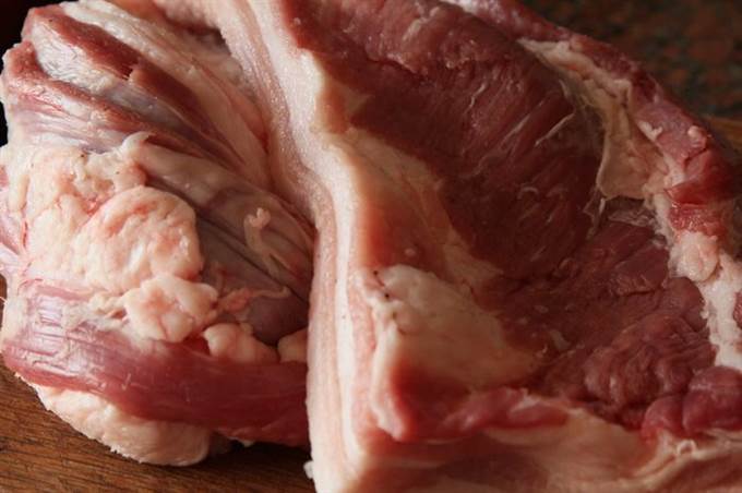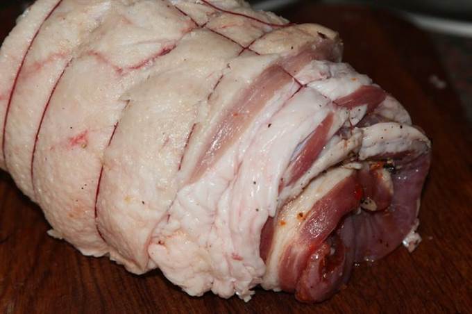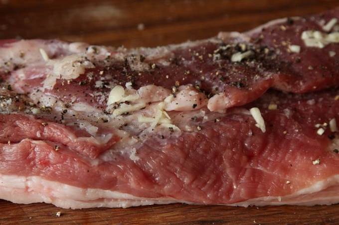 Разворачиваем его, солим, перчим по вкусу, рубим ножом чеснок и натираем им наш кусок.