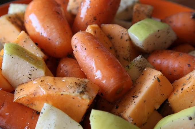 Затем овощи и айву посолила, поперчила, добавила базилик и все хорошенько встряхнула в миске, добавила немного растительного масла и еще раз перемешала.