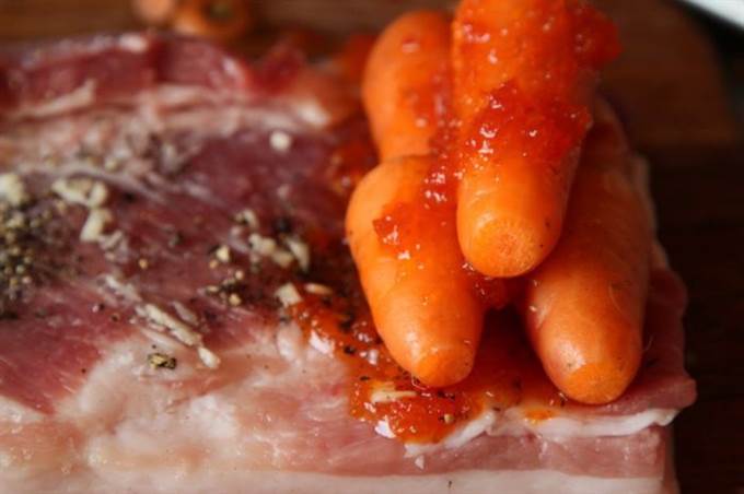 Я в этом рецепте использовала острый соус, кстати очень сильно рекомендую тем, кто любит необычные острые сочетания. С одной стороны намазала подчеревок соусом и выложила морковь.