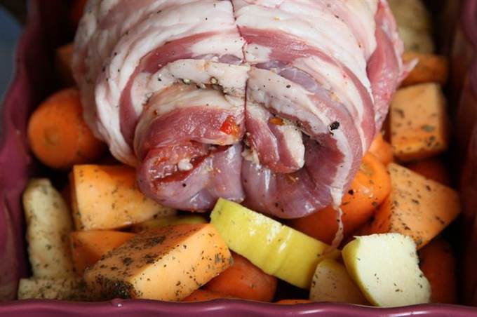 Духовку разогрела до 200 градусов, внизу поместила емкость с водой и отправила запекаться наше блюдо. Запекалось 2,5 часа. Влажная среда в духовке не даст пересохнуть ни овощам, ни мясу. Вот так красиво, ярко и аппетитно все получилось.